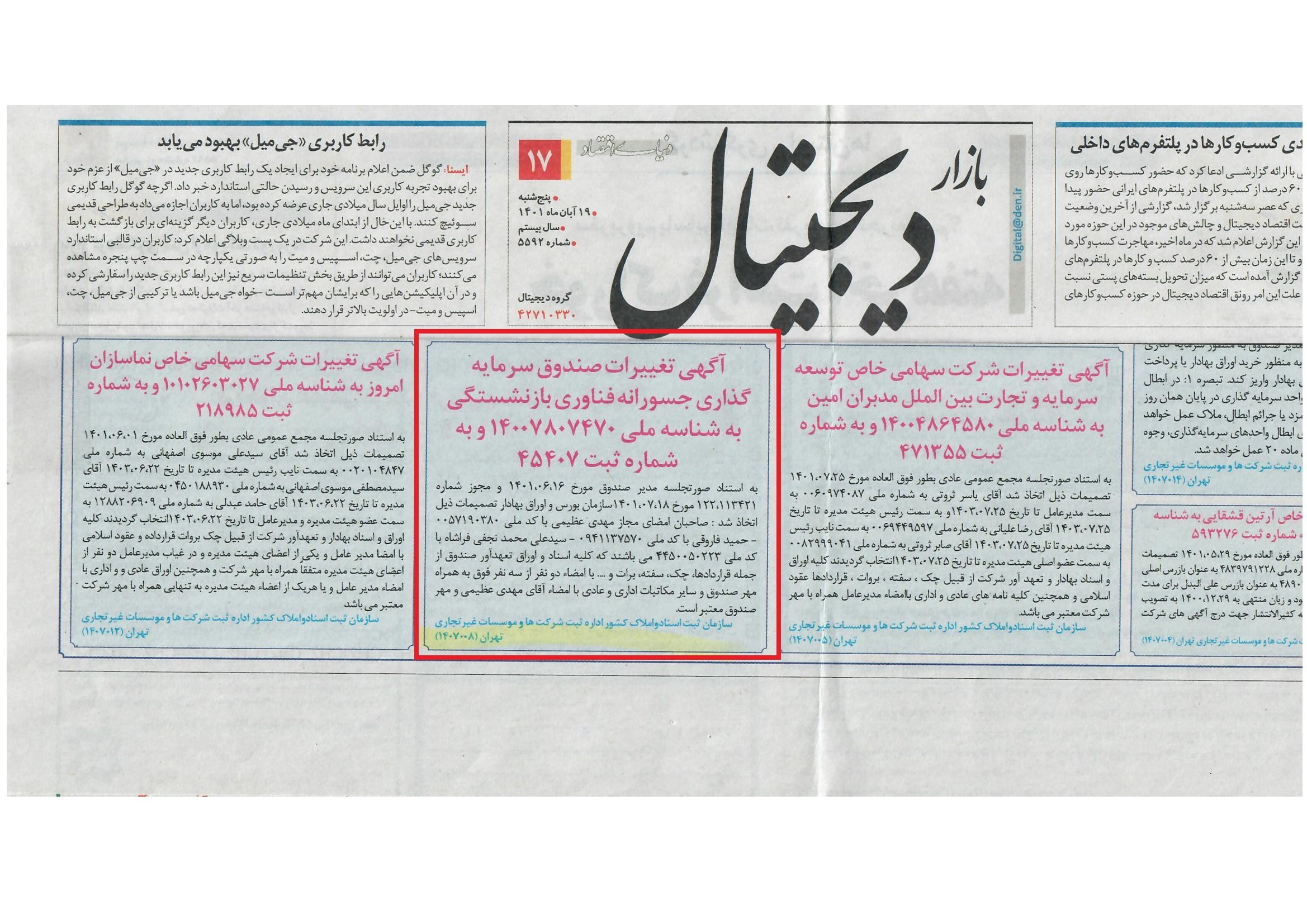 روزنامه رسمی و آگهی صورتجلسه مجمع 1400/11/03 صندوق سرمایه گذاری جسورانه فناوری بازنشستگی